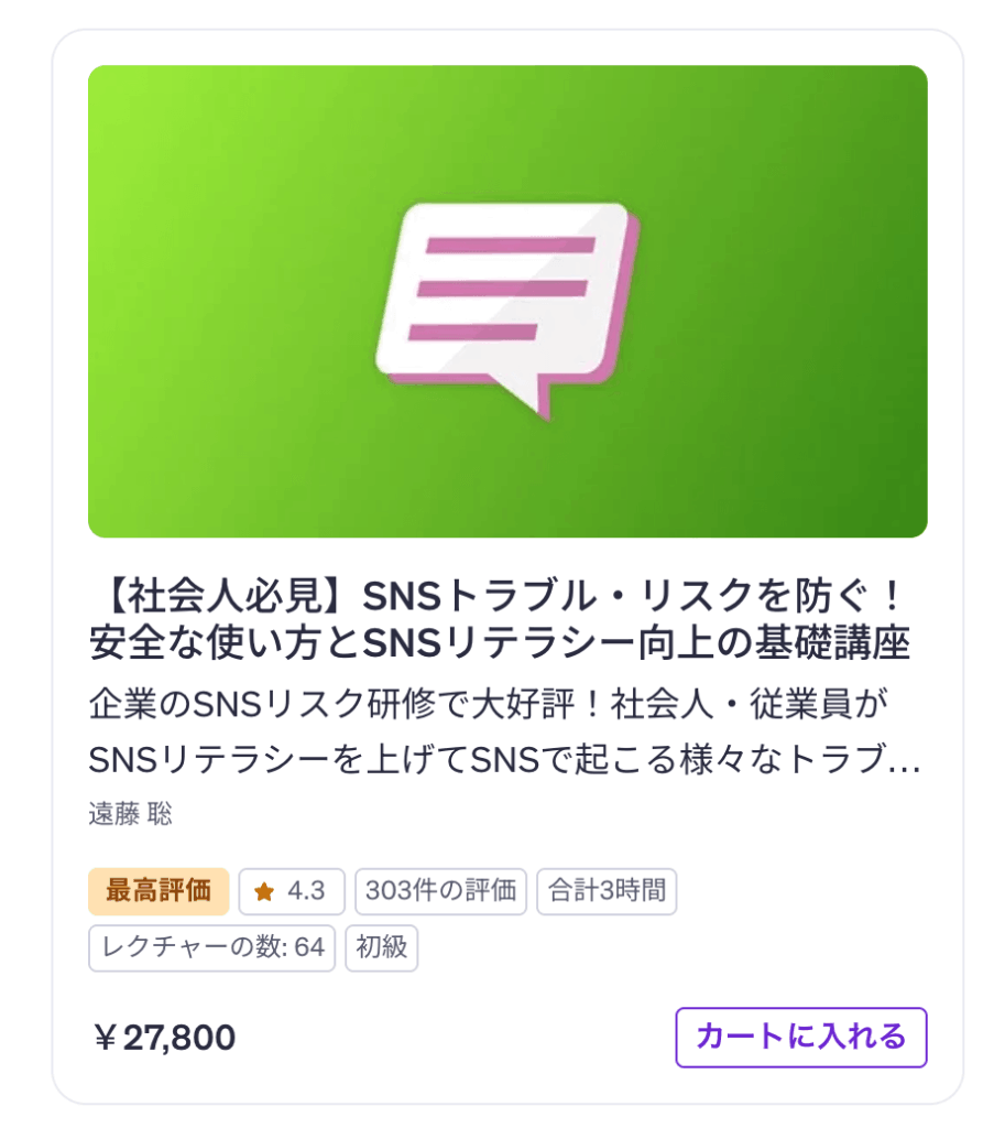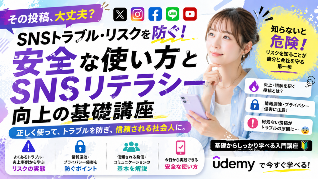 まずは自分自身のSNSリテラシーを高めたい方には、Udemy講座での学習がおすすめです。